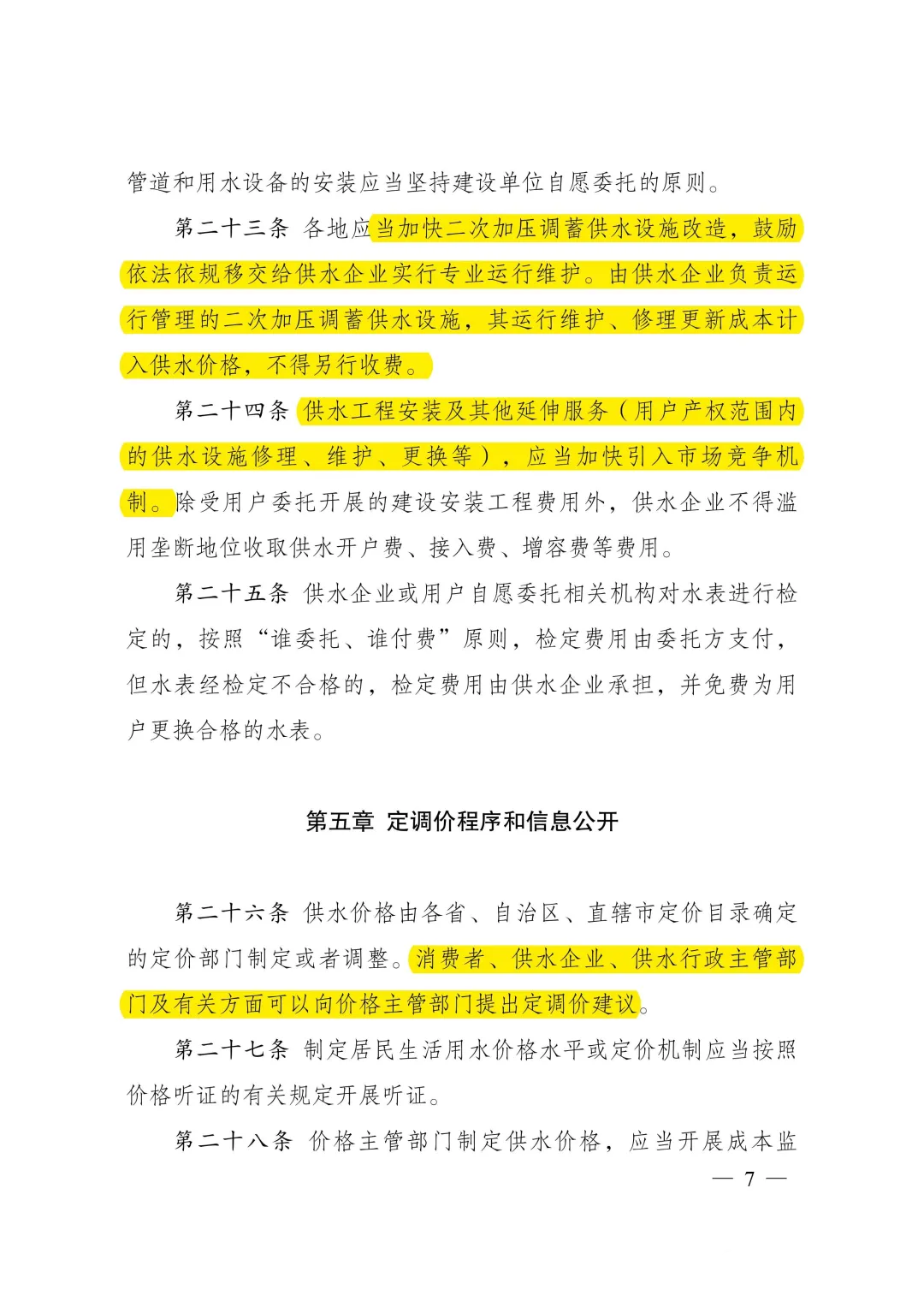 四是建立了供水價格定期校核機制和補償機制。明確城鎮供水價格監管周期原則上為3年,建立供水價格與原水價格等上下游聯動機制的,監管周期年限可以適當延長。考慮當地經濟社會發展水平和用戶承受能力等因素,由于價格調整不到位導致供水企業難以達到準許收入的,當地人民政府應當予以相應補償。