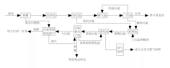 德國k?hlbrandh?ft/dradenau 污水處理廠位于德國漢堡,應(yīng)屬德國最大的污水處理廠,負(fù)責(zé)處理周邊200萬居民生活污水以及歐洲第三大海港工業(yè)廢水。處理水量達(dá)38.2×104m3/d(規(guī)模約為240萬當(dāng)量人口,pe);進(jìn)水水質(zhì)為:cod=850 mg/l,tn=67 mg/l,tp=9.4 mg/l。該廠由漢堡水務(wù)公司經(jīng)營,改造前是該市最大公共能源消耗單位之一。該廠主流處理工藝為活性污泥法,生化段出水投加化學(xué)藥劑除磷。污泥處理包括剩余污泥厭氧消化產(chǎn)沼氣、沼氣熱電聯(lián)產(chǎn)、消化后污泥繼續(xù)干化、焚燒用于能量回收。該廠污水、污泥處理全工藝流程如圖2所示。