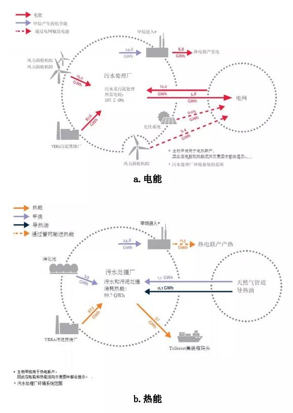 k?hlbrandh?ft/dradenau污水處理廠對剩余污泥進(jìn)行厭氧消化,同時收集廠外生物廢棄物與污泥共消化以增加沼氣產(chǎn)量,并實(shí)現(xiàn)沼氣轉(zhuǎn)換為天然氣對外輸送。后續(xù)消化熟污泥施以焚燒處置,進(jìn)一步熱電聯(lián)產(chǎn)回收電能和熱能;電能彌補(bǔ)自身電耗使用,熱能則被輸送至污泥干化設(shè)備,可完全滿足高溫干化需要;污泥干化后的低溫余熱可繼續(xù)供消化池保溫使用。如此設(shè)計(jì),可實(shí)現(xiàn)電能與熱能高效回收利用。此外,自2009年起該廠富余熱能還向附近碼頭輸出供應(yīng)。圖3為該廠2018年電能與熱能流向示意圖。該廠污泥焚燒產(chǎn)能遠(yuǎn)遠(yuǎn)大于沼氣熱電聯(lián)產(chǎn),且應(yīng)用太陽能、風(fēng)能等清潔能源,實(shí)現(xiàn)能源回收的同時進(jìn)一步減少co2排放。2018年該廠總電耗為107.2 gw·h/a,產(chǎn)電量為115 gw·h/a,電能自給率達(dá)107%;總熱耗為99.7 gw·h/a,產(chǎn)熱量為113 gw·h/a,熱能自給率達(dá)113%。可見,該廠通過自身進(jìn)水中高濃度有機(jī)物(cod=850 mg/l)、外源有機(jī)廢棄物、太陽能、風(fēng)能等綜合利用,已超越能源中和目標(biāo)并可向外供氣(ch4)和熱。預(yù)計(jì)未來該廠將達(dá)到發(fā)電量大于耗電量的30%,熱能供應(yīng)范圍也將進(jìn)一步擴(kuò)大。