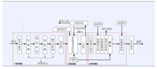 典型的污水廠處理工藝流程是上述方法的組合。以某一級(jí)a標(biāo)準(zhǔn)污水處理廠為例,從進(jìn)水到出水主要分三級(jí)處理區(qū),一級(jí)處理區(qū)主要應(yīng)用物理法(包括攔截、沉淀、除砂等)及一定的化學(xué)法(初沉池前絮凝);二級(jí)處理區(qū)是污水處理工藝核心,主要是以活性污泥為主的生化反應(yīng)(酶促反應(yīng));三級(jí)處理區(qū)主要應(yīng)用物理化學(xué)法,通過(guò)混凝、過(guò)濾、消毒等工藝手段對(duì)污水進(jìn)行深度處理。落實(shí)到具體處理工程中,各級(jí)各類(lèi)技術(shù)需針對(duì)不同污染物和污染情況進(jìn)行應(yīng)用和改進(jìn)。