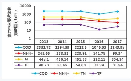 根據(jù)2013-2017年《中國統(tǒng)計年鑒》,我國廢水排放總量保持在700億噸,其中廢水中cod、氨氮(nh4+)、總氮(tn)、tp排放量如下圖,可見2015年國務院發(fā)布了《水污染防治行動計劃》(簡稱“水十條”)后,這幾種污染物排放量得到了削減。