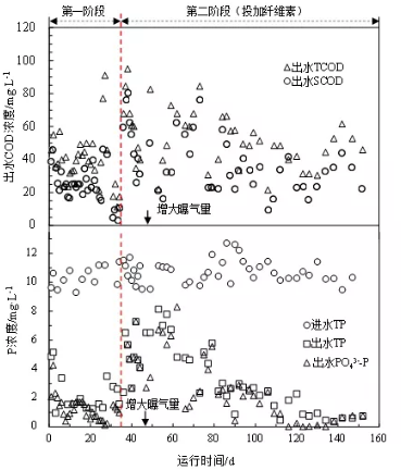 2.1 纖維素對cod與p去除的影響圖2顯示了小試裝置在整個試驗期間出水cod與磷濃度變化。在第一階段進水tcod濃度維持在450 mg/l時,出水tcod平均為(39.7±16.1)mg/l,其中scod為(24.8±10.8) mg/l,符合國家一級a排放標準。然而,當第二階段加入纖維素后,cod去除效果明顯惡化,出水tcod最高檢測值高達95 mg/l(scod為80 mg/l)。為探究加入纖維素后cod去除效果惡化原因,對出水tcod的構成進行了分析。結果顯示,加入纖維素后出水ss顯著下降,從(48.25±3.29) mg/l降至(21.34±9.71) mg/l,由此可排除污泥沉降性能惡化導致出水cod升高問題。纖維素富含官能團且呈線狀,因此其對污泥具有較好網捕卷掃作用,可促進污泥絮體凝結并提高其緊密度,這一現象通過污泥鏡檢也得到了印證。然而,不論是因纖維素自身作為cod消耗氧氣,還是導致污泥絮體變得緊密都有可能降低氧傳質,從而弱化了對cod的降解效率。為此,在第46 天對好氧池運行進行調整,將曝氣量提高至0.30~0.50 l/min(添加纖維素前為0.10~0.20 l/min)。結果,出水cod開始逐漸下降并恢復至投加纖維素前水平(tcod=49.4 mg/l,scod=34.2 mg/l)??梢姡厥绽w維素對曝氣池運行有著積極影響,可提高氧氣傳質與利用效率。