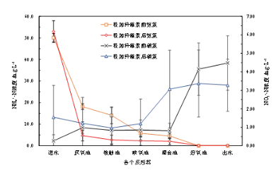 與此同時,纖維素投加對磷去除的影響與cod類似,在纖維素投加初期(第36~50 天),出水總磷(tp)和正磷酸鹽(po3-4-p)濃度均開始惡化,去除率分別降低至51.99%和56.32%。從發(fā)生原因來看,do不足是導致磷去除效率下降的主因,可以從增大曝氣量后出水tp逐漸下降得到驗證。然而,出水tp含量在提高曝氣量后的很長一段時間內也沒有恢復至投加纖維素前水平,而是保持在(2.86±1.22) mg/l左右。為進一步分析其原因,在第68 天從曝氣池末端取混合樣進行了聚磷菌(paos)活性測定,并與投加纖維素前的活性進行了對比。結果顯示,投加纖維素后,反應器中paos比釋磷速率和比吸磷速率分別為11.3 和12.0mg/(gvss?h),與投加前的10.8 、13.4 mg/(gvss?h)相比變化并不是很大。可見,纖維素的投加對paos活性的影響并不大。因此,反應器除磷效果恢復較慢的原因可能與纖維素投加初期導致的跑泥和生物量恢復較慢有關。2.2 纖維素對氮去除的影響圖3顯示了在投加纖維素前后裝置對氮去除效果的變化。從整體上看,反應器無論是否投加纖維素均能夠很好地完成脫氮,投加前出水tn、nh4+-n和 no3--n平均濃度分別(5.9±3.1)、(0.40±0.96)(4.59±2.22)mg/l,投加后為(7.80±5.46)、(1.30±2.00)、(4.11±2.22) mg/l。只是在纖維素投加初期,出水tn出現明顯惡化,此時出水中nh4+-n明顯增多,這顯然與上述氧傳質受限有關。圖3顯示,在增大曝氣量后對tn的去除效率迅速恢復,主要是因為硝化能力開始恢復。