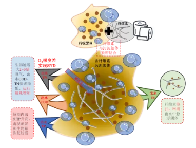 2.3 纖維素對運行的影響纖維素對反應器運行影響是兩方面的,似乎均與其對污泥絮體致密程度有關。圖6總結了纖維素對反應器運行、能耗等方面的影響及其機理。纖維素通過自身線狀形態(tài)和官能團可靠網捕卷掃作用將污泥絮體密實包裹,相當于促進絮凝,可降低出水ss以及其中所含n、p。