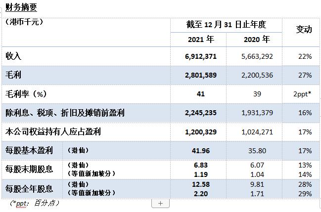 二零二一財(cái)政年度,本集團(tuán)經(jīng)營(yíng)勢(shì)頭穩(wěn)健,錄得收入69.1億港元,較二零二零財(cái)政年度增長(zhǎng)22%;除利息、稅項(xiàng)、折舊及攤銷前盈利22.5億港元,較二零二零財(cái)政年度增長(zhǎng)16%;本公司權(quán)益持有人應(yīng)占盈利12.0億港元,較二零二零財(cái)政年度增長(zhǎng)17%;每股基本盈利41.96港仙,較二零二零財(cái)政年度增加6.16港仙,增幅17%;整體毛利率為41%,較二零二零財(cái)政年度上升2個(gè)百分點(diǎn)。本集團(tuán)融資渠道多元暢通,融資工具長(zhǎng)短期兼?zhèn)洌Y產(chǎn)質(zhì)優(yōu),資金充裕,負(fù)債合理,財(cái)務(wù)狀況健康。