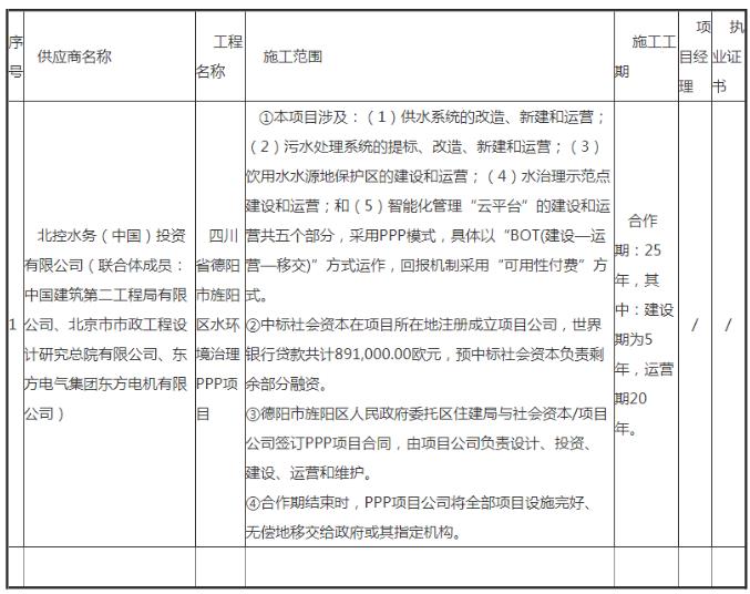 3月11日,四川省德陽市旌陽區水環境治理ppp項目采購結果確認談判公示發布,中標人為北控水務(中國)投資有限公司(聯合體成員:中國建筑第二工程局有限公司、北京市市政工程設計研究總院有限公司、東方電氣集團東方電機有限公司)聯合體,中標價為15590.26608萬元。